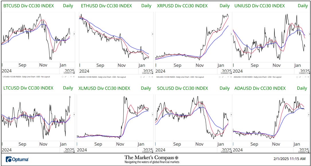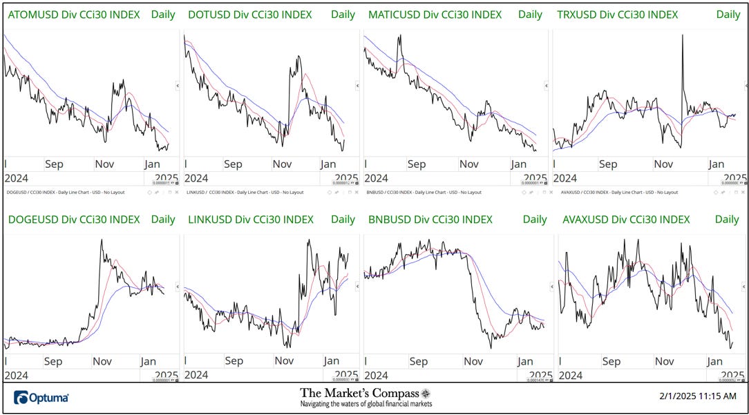 The two charts below are longer term line charts of the Relative Strength or Weakness of the Sweet Sixteen Crypto Currencies vs. the CCi30 Index that are charted with a 55-Day Exponential Moving Average in blue and a 21-Day Simple Moving Average in red. Trend direction and crossovers, above or below the longer-term moving average, reveal potential continuation of trend or reversals in Relative Strength or Weakness.