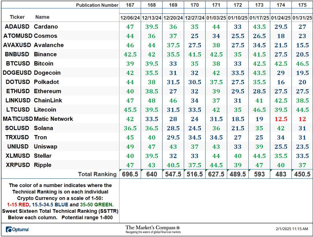 The Excel spreadsheet below indicates the weekly change in the objective Technical Ranking (“TR”) of each individual Cryptocurrency and the Sweet Sixteen Total Technical Ranking (“SSTTR”).