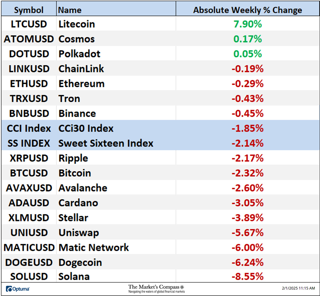 Welcome to this week’s publication of the Market’s Compass Crypto Sweet Sixteen Study #175. The Study tracks the technical condition of sixteen of the larger market cap cryptocurrencies. Every week the Studies will highlight the technical changes of the 16 cryptocurrencies that I track as well as highlights on noteworthy moves in individual Cryptocurrencies and Indexes. As always paid subscribers will receive this week’s unabridged Market’s Compass Crypto Sweet Sixteen Study sent to their registered email*. Past publications including the Weekly ETF Studies can be accessed by paid subscribers via The Market’s Compass Substack Blog.