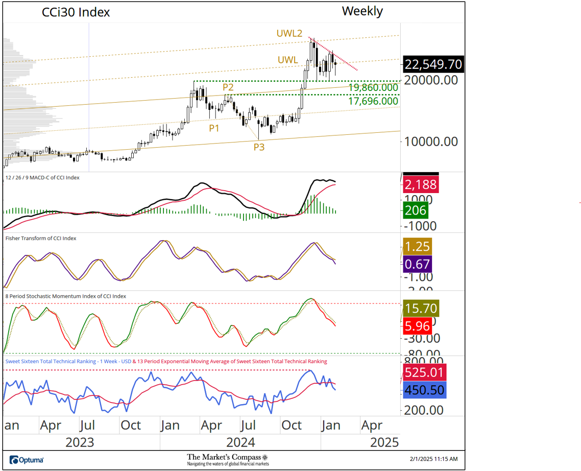 The CCi30 Index remains “trapped” in what the bulls should hope is a triangulating consolidation pattern. Although MACD continues to reflect the obvious loss of upside price momentum it remains elevated in positive territory above its signal line but the shorter-term Stochastic Momentum Index continues to track lower after signaling an overbought condition in early January. My Sweet Sixteen Total Technical Ranking (bottom panel) continues to pull back from overbought territory (red dashed line). As I wrote last week, key to the bullish consolidation technical argument case will be that key support at 19,860 holds and prices are able to overtake the trend of lower highs highlighted with red dashed line.