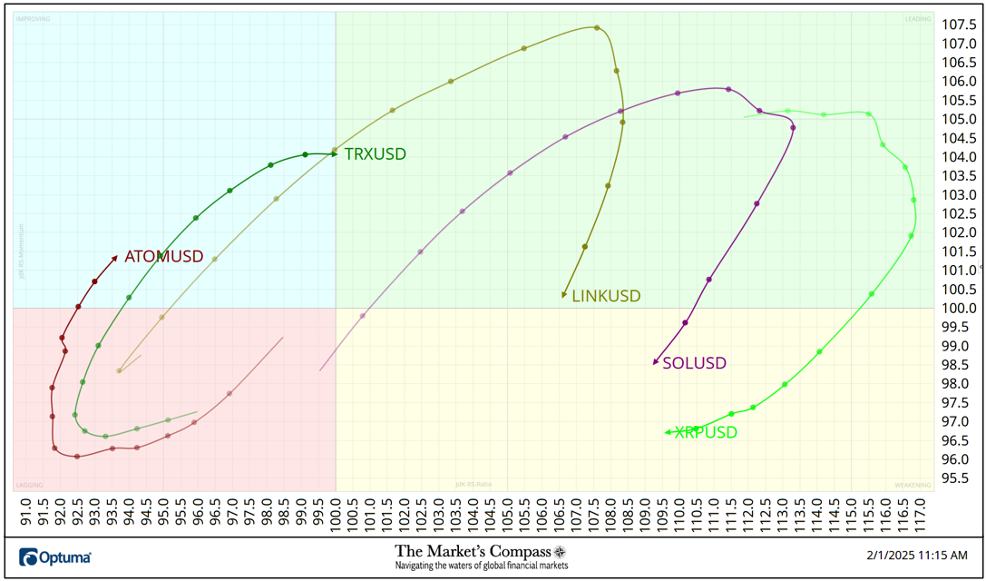 Over the past two weeks both Tron (TRX) and Cosmos (ATOM) have escaped the Lagging Quadrant and have entered the Improving Quadrant. In the case of TRX, it is only one good day on a Relative Strength basis from entering the Leading Quadrant although there was a slowing of Relative Strength Momentum late last week. Ripple (XRP) rolled over in the Leading Quadrant a week ago last Friday and has fallen into the Weakening Quadrant. That weakening of Relative Strength and Relative Strength Momentum was followed by Solana (SOL) and ChainLink (LINK) last week.