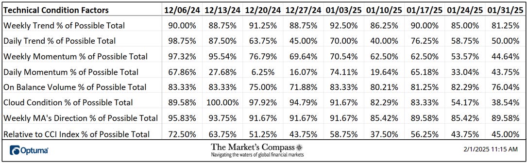 The Technical Condition Factor* changes for the week ending January 31st with the trailing eight weeks added.