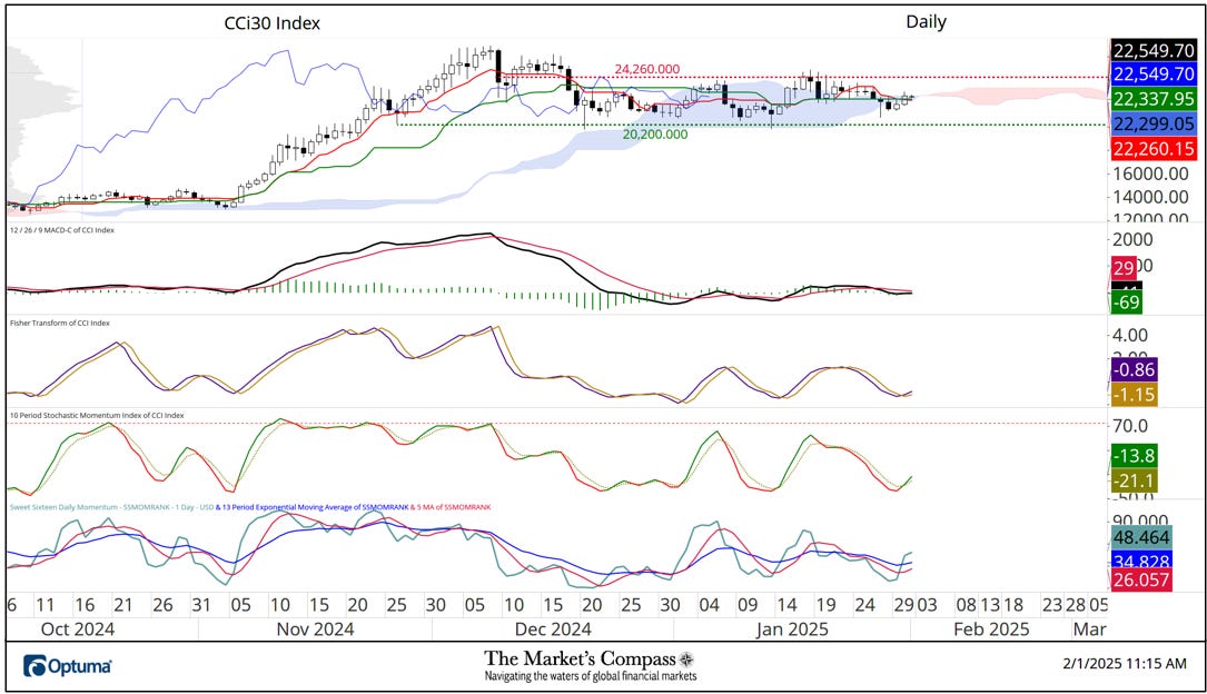 The technical condition of the CCi30 Index on the daily price chart has not changed in a significant way over the past seven days aside from a turn in short-term price momentum as witnessed by the Stochastic Momentum Index and the Fisher Transform retaking the ground above its sinal line. That said, only a rally that advances the Index through key price resistance at the 24,260 level with follow through would suggest that the price action since early December has merely been a period of consolidation prior to new highs.