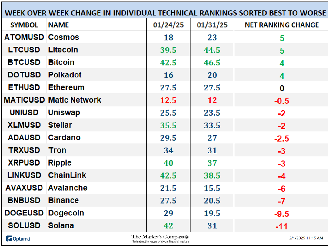 *An explanation of my objective Individual Technical Rankings go to www.themarketscompass.com. Then go to the MC’s Technical Indicators and select “crypto sweet 16”.